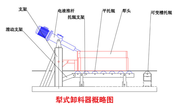 犁式卸料器(又稱(chēng):犁煤器)安裝前須對(duì)設(shè)備結(jié)構(gòu)及主要部件作了解,犁式卸料器由:犁頭、托輥、托輥支架、電液推桿等組成,詳細(xì)見(jiàn)下圖: